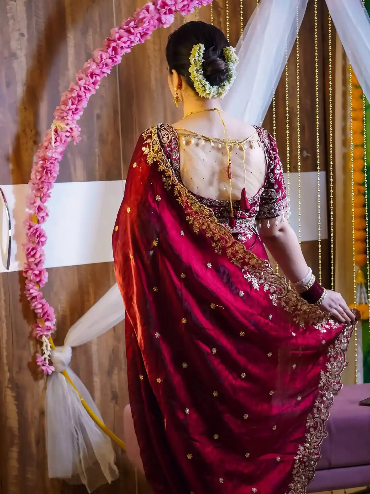 A timeless maroon saree crafted for women who love premium festive wear with detailed craftsmanship and a modern royal touch.